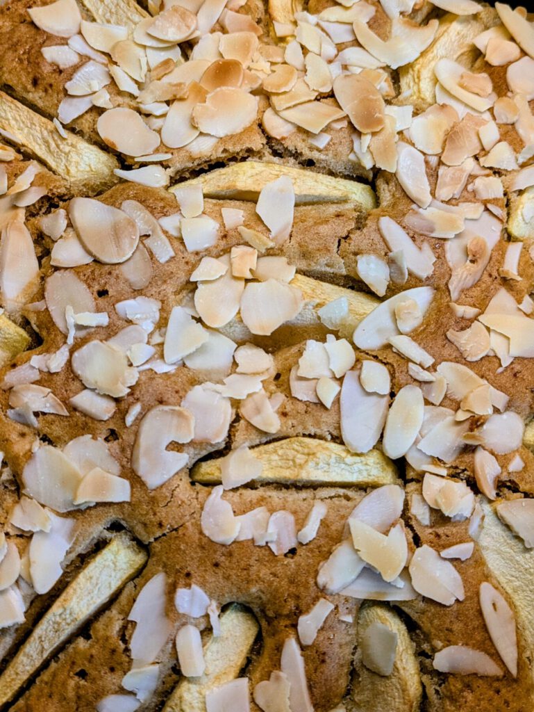 Ich heize den Ofen auf 180 °C Ober-/Unterhitze vor, weil der Kuchen mit Umluft zu schnell austrocknet. Der Teig reicht ideal für eine 24er Springform, die natürlich gefettet werden muss. Mehl, Backpulver, Zimt und Salz mischen, in einer anderen Schüssel Apfelmus, Zucker, Öl und Pflanzenmilch (ich nehme Hafermilch) verrühren, dann die trockene Zutaten kurz unterrühren (nicht zu lange mixen). Einen geschälten Apfel klein würfeln und unter den Teig heben, den Teig in die Form füllen und einen Apfel in Spalten schneiden, oben auflegen und leicht andrücken. Ich vertrage Mandeln gut und mache noch Mandelplättchen darüber. 40–45 Minuten backen. Guten Appetit!